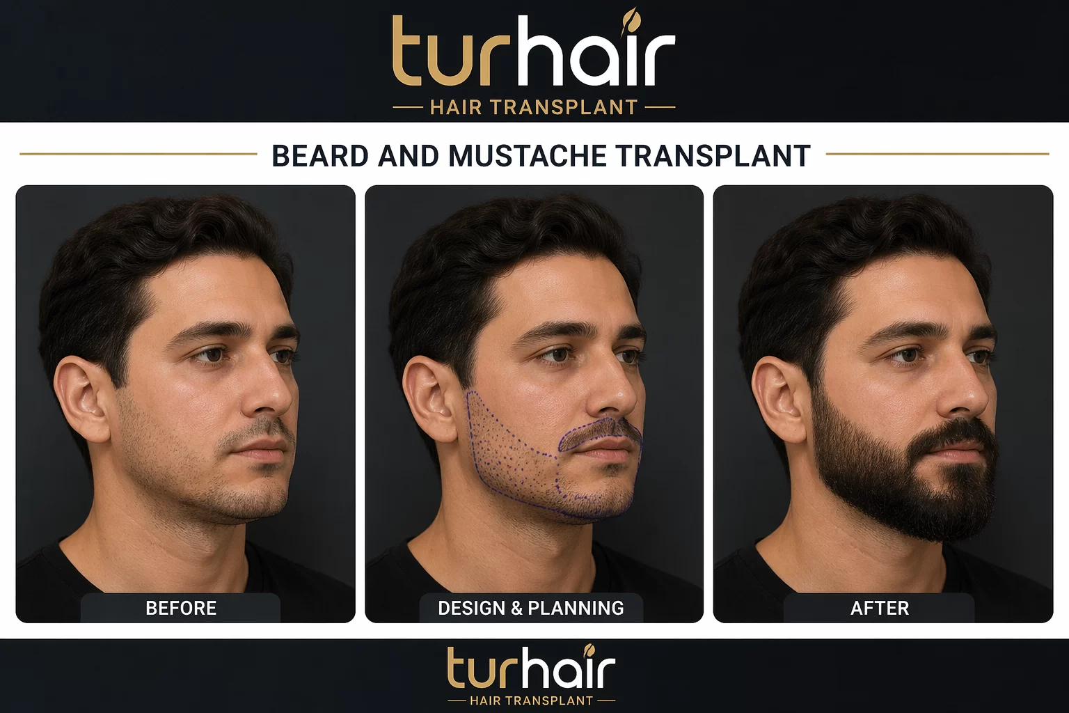 Beard and mustache transplant before and after results showing natural full beard transformation by Turhair