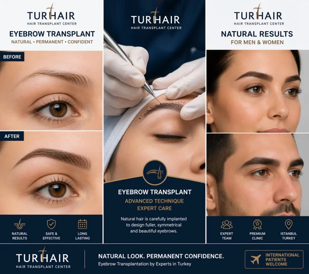 Eyebrow transplant before and after results in Turkey at Turhair clinic showing natural permanent eyebrows