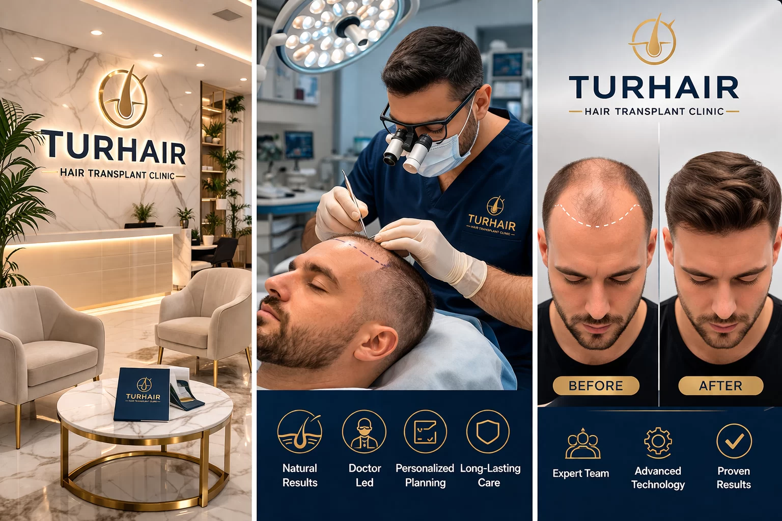 Esta imagen representa el proceso de trasplante capilar en Turquía en 2026, incluyendo la transformación del paciente, la apertura de canales dirigida por un médico y una experiencia premium. En Turhair, los procedimientos de trasplante capilar se realizan con enfoque en resultados naturales, donde el médico abre personalmente los canales, un paso crítico que afecta hasta el 70–80% del resultado final. Las imágenes también reflejan a Estambul como un destino líder en turismo médico.